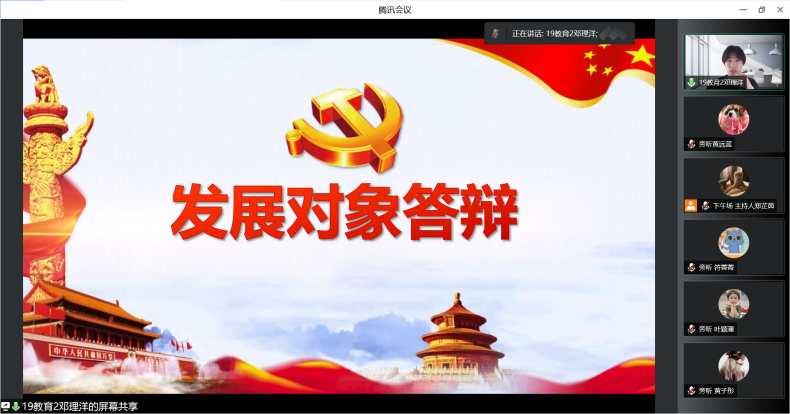 在各位发展对象答辩过后,各评委老师根据发展对象的个人汇报内容以及党的基本理论知识、当下时事热点对其进行提问。通过答辩环节进一步检验发展对象们对党组织的了解程度以及入党动机,对党史理论知识的熟悉程度,检验其是否具备良好的思想道德素质和法治素养。在此环节中,同志们都能从容地发表自己的观点,流畅地回答党的基本知识,表明自己的入党态度。