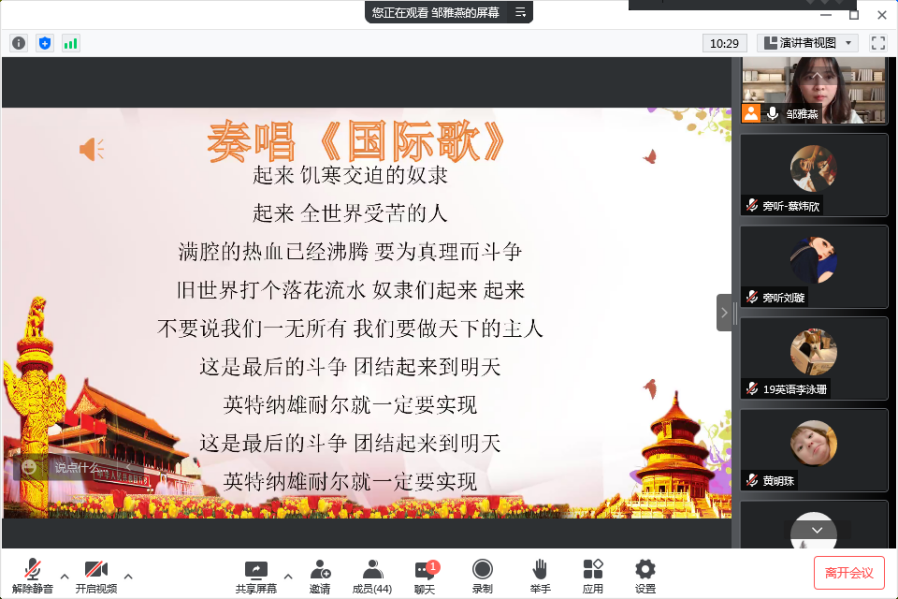 本次大会共有两项议程,一、奏唱国际歌;二、发展对象答辩。