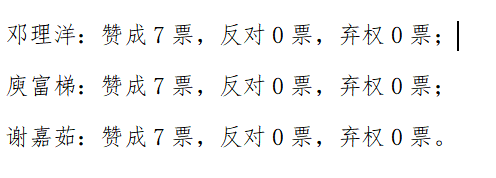 特此,经过评议和无记名投票表决,同意邓理洋等3名同志发展为中共预备党员。本支部共有正式党员12名,实到7名。名单及得票情况如下: