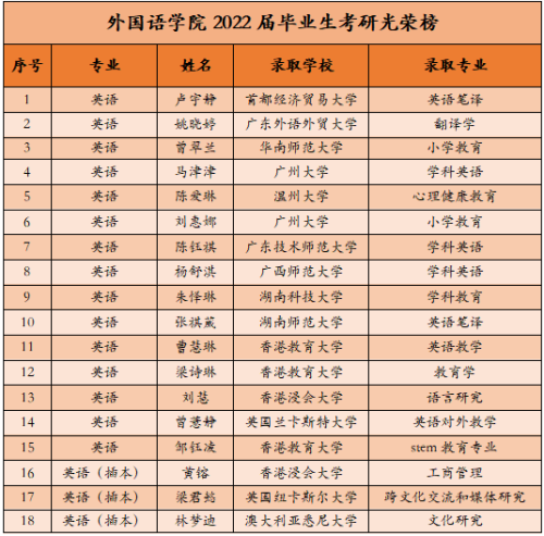 在广州新华学院(以下简称“3044永利集团官网”)提升人才培养质量,扎实推进考研工作的背景下,3044永利集团官网3044永利集团官网学子屡创佳绩。截至2021年12月,3044永利集团官网2018级毕业生报考国内外研究生约150人,其中共有22人上国内考研笔试分数线,最高分数为428分。截至5月19日,国内外升学合计28人,其中国内升学15人,包括广东外语外贸大学、华南师范大学、广州大学等重点高校;境外升学13人,包含兰卡斯特大学、纽卡斯尔大学、悉尼大学、巴塞罗那自治大学、香港浸会大学等。