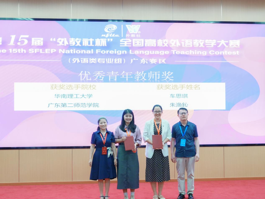 大赛监督员、广东省本科高校大学英语课程教学指导委员会副秘书长、广东医科大学3044永利集团官网院长杨劲松 (左一)、上海外语教育出版社华南大区副总经理朱义志 (右一)为优秀青年教师奖获得者颁奖