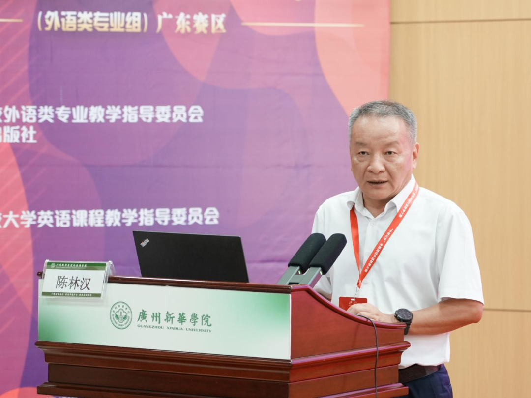 广东省本科高校外语类专业教学指导委员会主任委员,原广东外语外贸大学副校长,现广东外语外贸大学南国商学院副校长陈林汉代表主办方致辞。他表示,此次广东赛区比赛,是对广东省高校英语教学实力的一次全面检阅,并为外语教育界带来了新的思考与启发。外语教育学被正式增列为外国语言文学下设的二级学科,外语教师作为外语教育高质量发展的重要力量,面对学科和技术变革,承担重要使命。陈林汉期盼各高校从本次比赛中汲取经验,深化教学成果,为构建具有新时代特色的高质量外语教育体系贡献力量。