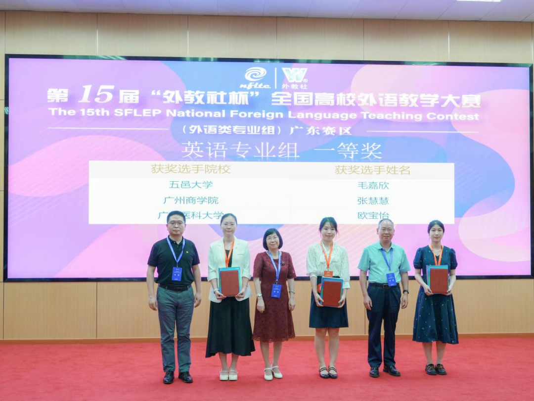 上海外语教育出版社副社长黄卫 (左一)、 广州新华学院党委书记郝登峰 (右一)为英语专业组特等奖获得者颁奖