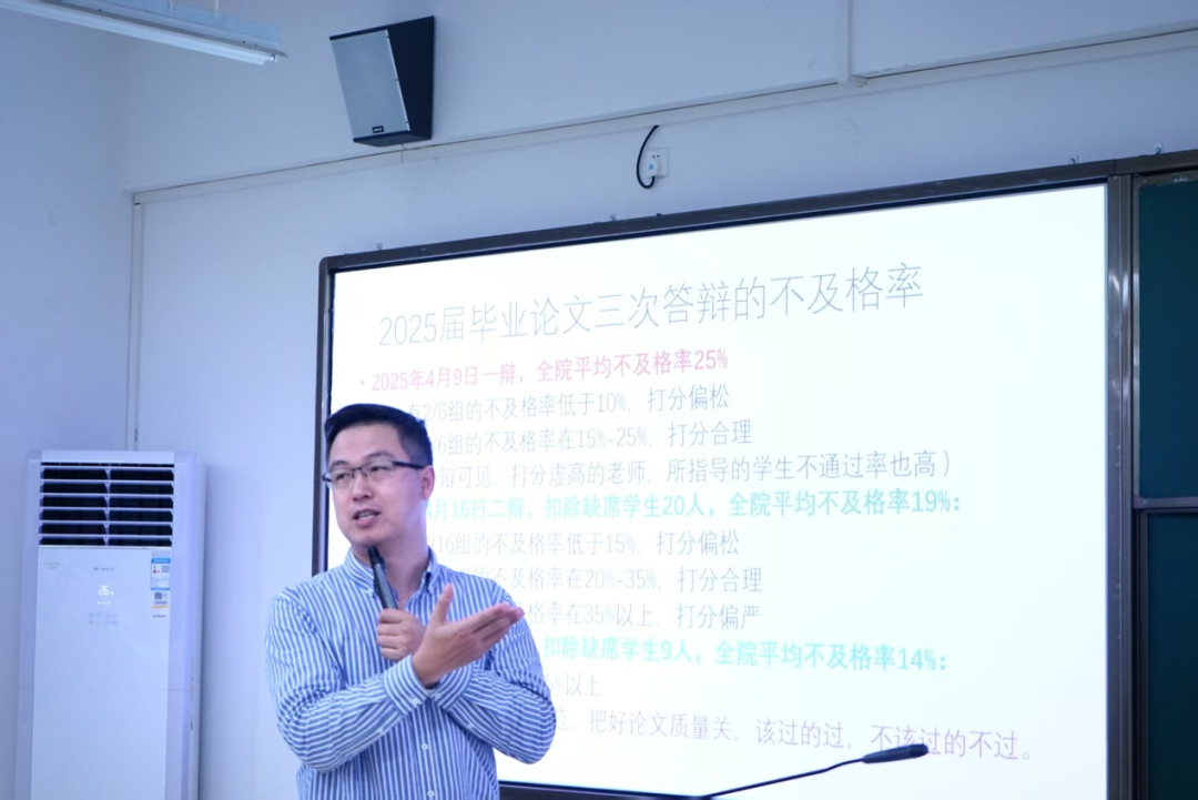 然后,李贻副院长对2025届毕业论文工作情况进行总结,进一步规范毕业论文过程管理,提高毕业论文指导质量;围绕第三轮教学诊断评估问题清单,针对评估专家反馈的薄弱环节,提出整改举措,要求全体教师高度重视、协同落实;还带领全体教师共同学习“新文科”、OBE理念及应用型人才培养内涵,要以人才培养大纲修订为契机,教师以课程教学大纲为抓手着力加强课程体系建设和课程教学改革,将OBE理念内化于心、外化于行,推动OBE理念取得实效。