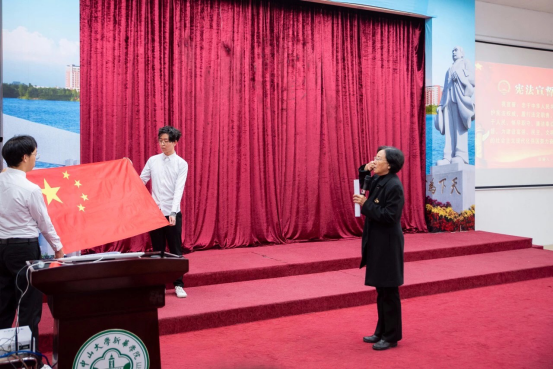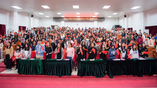 外院师生党员代表与来自全校近400名师生代表一同观看了教育部在北京全国青少年学生法治教育实践示范基地举办的“宪法晨读”活动直播,同步跟读宪法部分条款,面向宪法和国旗庄严宣誓,齐声合唱歌曲《我和我的祖国》。宪法宣誓仪式由法学院党总支书记李岚同志领誓,党委宣传部副部长(主持工作)刘英同志主持活动。