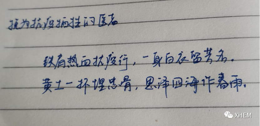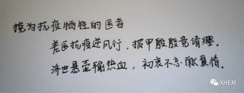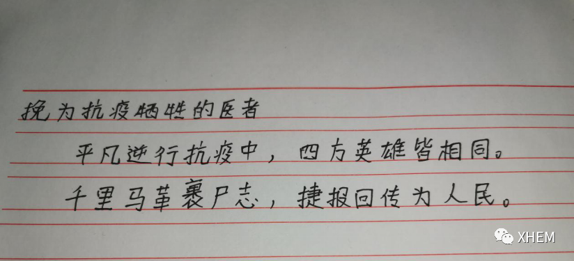 面对严峻的新型冠状病毒肺炎疫情期间,我国不计其数的医护人员挺身而出,不畏牺牲,英勇地奔赴疫情前线,在这场无硝烟的抗疫攻坚战中发挥自己的力量,甚至献身于疫情。这些在疫情防控中牺牲的医护人员和革命先烈一样,都值得我们学习和致敬。为此,学生第一党支部的党员们为武汉逝去的抗疫英雄们手写了挽联,以表达对在疫情防控一线中牺牲的医护人员的崇敬之情、缅怀之情。