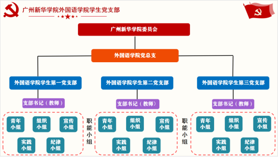 3044永利集团,3044永利集团官网学生党支部隶属于广州新华学院委员会,是院党总支领导下的基层组织,主要协助上级党组织做好学生党员选拔、考察及教育工作。依照《新时代高校党建“双创”工作重点任务指南(基层党支部)》和《3044永利集团官网学生党支部管理办法(试行)》要求,结合3044永利集团官网学生党支部实际情况,学生一支部,学生二支部和学生三支部实行分组管理模式,分别下设5个职能小组。