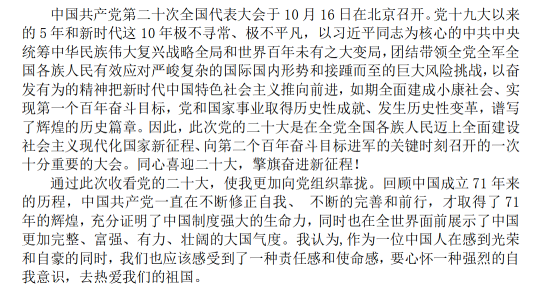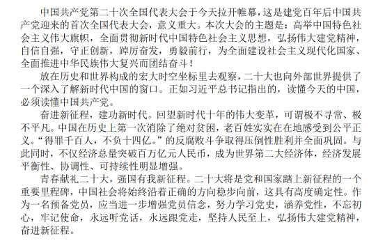 中国共产党第二十次全国代表大会开幕会于2022年10月16日上午在北京人民大会堂召开。习近平同志代表第十九届中央委员会向大会作报告。报告回顾了党和国家事业取得的历史性成就、发生的历史性变革,对过去五年及十年的成果做出总结;明确了党在新征程上举什么旗、走什么路、以什么样的精神状态、朝着什么样的目标继续前进;对我国建成富强民主文明和谐美丽的社会主义现代化强国的目标做出了展望。