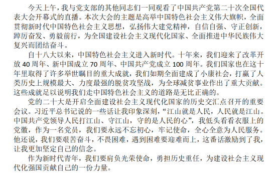 会议伊始,全体党员起立,以饱满的热情奏唱国歌,以此拉开序幕。接着,全体党员共同收看学习总书记在中国共产党第二十次全国代表大会作出的重要报告。本次报告强调了一个主题;明确了一个中心任务;确定了“两步走战略安排”;提出了3个“务必”;提出了六个坚持;发出了一个伟大号召,是在全党全国各族人民迈上全面建设社会主义现代化国家新征程、向第二个百年奋斗目标进军的关键时刻召开的一次十分重要的大会。收看过程中,大家全神贯注,边看边记。会后,党员同志们激情饱满,倍感振奋,反响热烈。