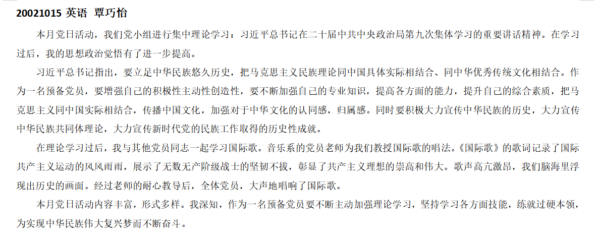 通过对《国际歌》的深入学习,党员同志们更深入地认识到理想信念与使命意识的重要性。新时代的党员要发挥党员先锋模范作用,肩负好铸牢中华民族共同体意识的使命担当。希望各位同志在未来的日子不忘初心、牢记使命,始终保持党员的责任感和使命感,在新时代新征程上谱写壮丽的青春之歌!