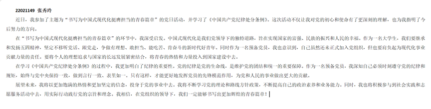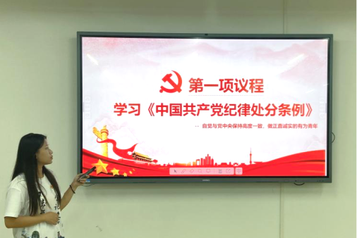 第一议题学习后,陈佩霞同志以“学习《中国共产党纪律处分条例》”作为第一项议程,带领全体党员深入学习中国共产党的纪律处分条例,引导各位同志明确党内纪律,规范自身行为,自觉与党中央保持高度一致,做正直实诚的有为青年。