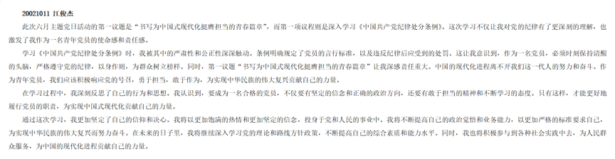 针对本次党日主题活动的内容,党员同志们积极发表了自己的心得与感受。其中,罗慧婷同志认为:遵守纪律,自觉规范自身行为是每一位党员的职责。范海星同志认为:身为党员,要将党的严格纪律内化于心,外化于行。江俊杰同志则认为:党员同志应当自觉与当中央保持高度一致,维护党内纪律严明的光荣传统与独特优势。