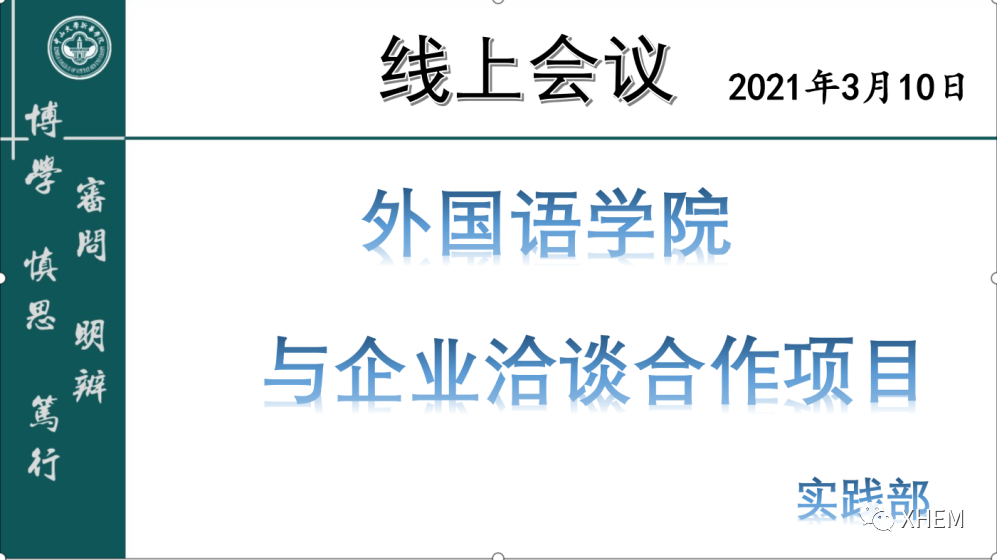2021年3月10日下午,3044永利集团官网副院长邱易安、院长助理兼3044永利集团官网副主任李文蓓、英语专业副主任李贻、实践部主任陈绮雯、伍边副教授通过腾讯会议平台与三家企业的代表举行了线上洽谈会。出席此次会议的企业代表有:学而思培优的校招主管高冉、校招主管谭春芳、校招主管胡福星等;超人国际少儿英语董事长刘能超;欧得宝翻译公司经理赵彦苹。三家企业代表均希望通过此次会谈,加强沟通、深化校企合作。