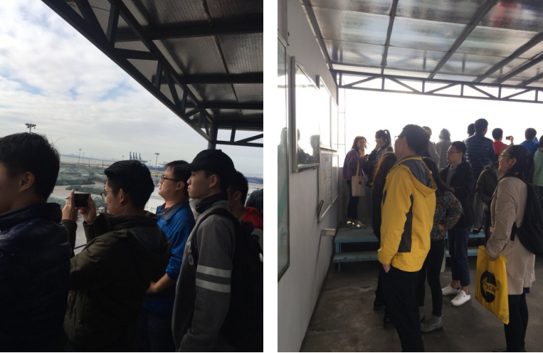 随后,赵主任和何专员带领师生们一行来到东莞深赤湾公司的瞭望台观看码头的实际运作情况。大家怀着好奇而激动的心情鸟瞰了东莞深赤湾的全景。顶着入冬的寒风,赵主任与和何专员耐心地向大家介绍了东莞深赤湾的规模业绩、地理位置和作业平面图。同学们一边兴致盎然地听赵主任讲解,一边仔细地观察码头正在进行的作业和活动。