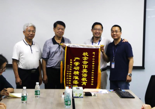图为赠予锦旗仪式,李中生副校长(左二)、黄继炎副院长(左一)、吴东方经理(右二)和赖明富先生(右一)