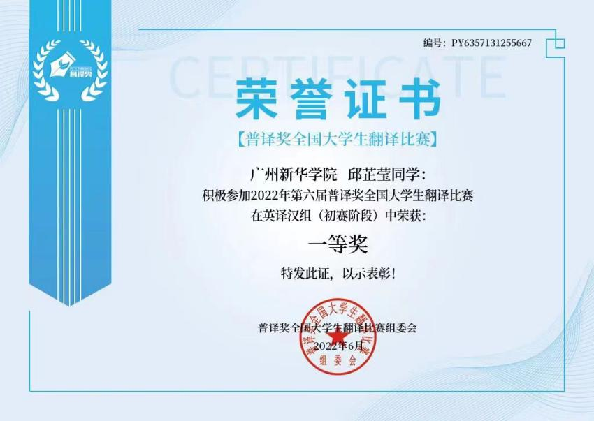 英专学子邱芷莹荣获2022年第六届普译奖全国大学生翻译比赛(初赛阶段)一等奖