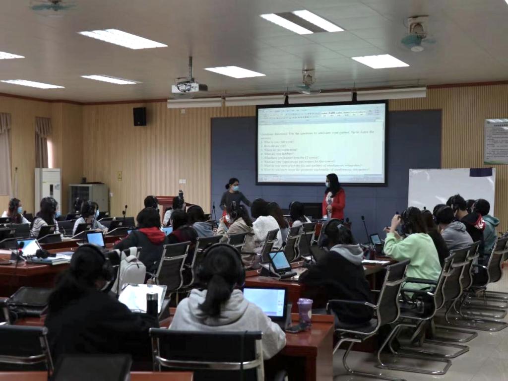 广东电视台签约译员、双师型教师高平在带领学生进行同声传译实训